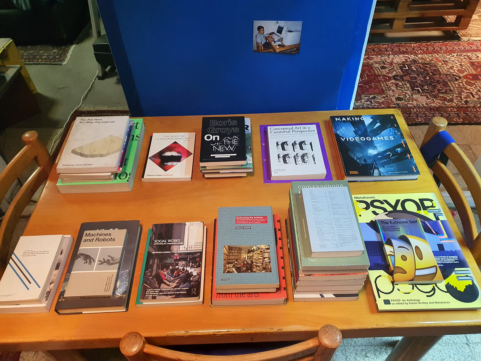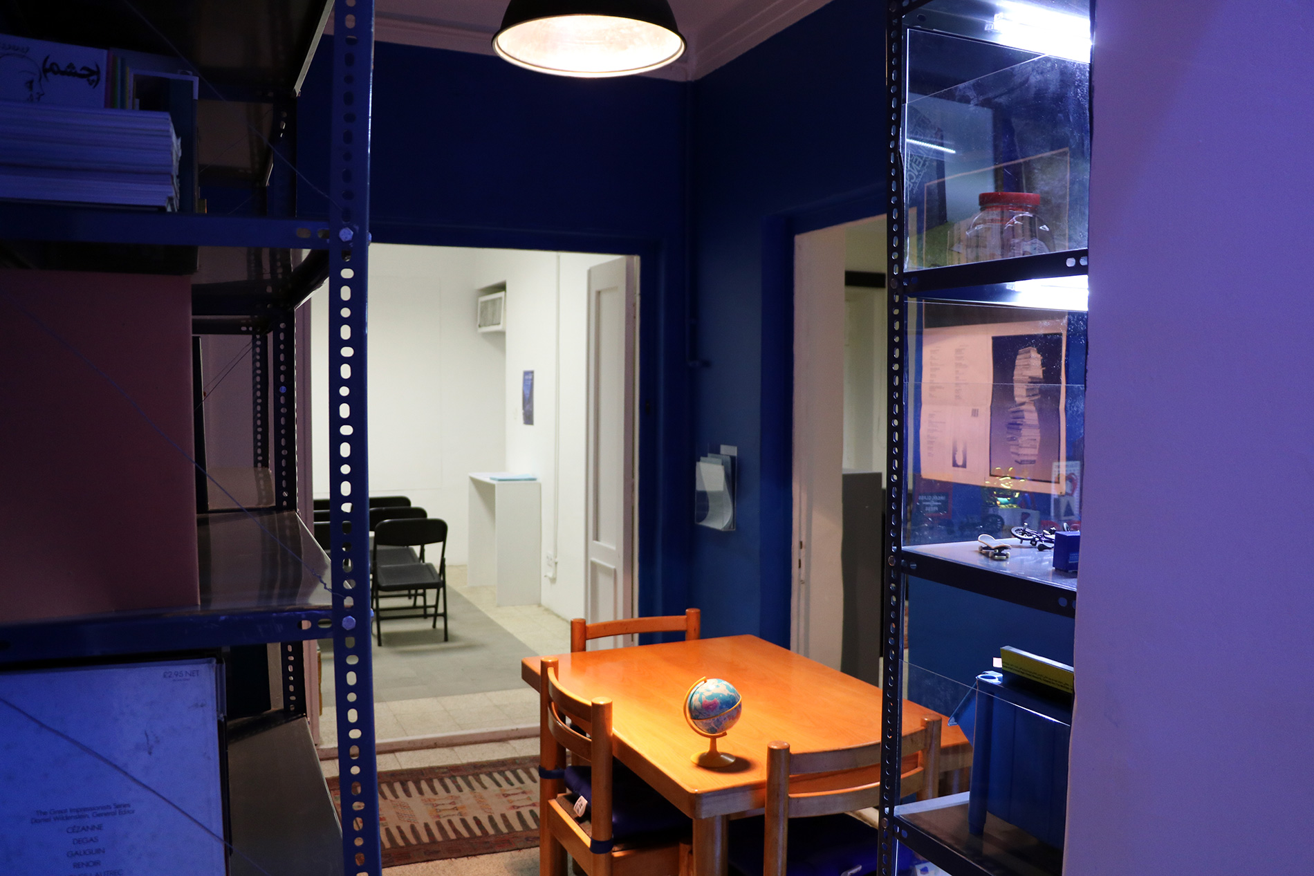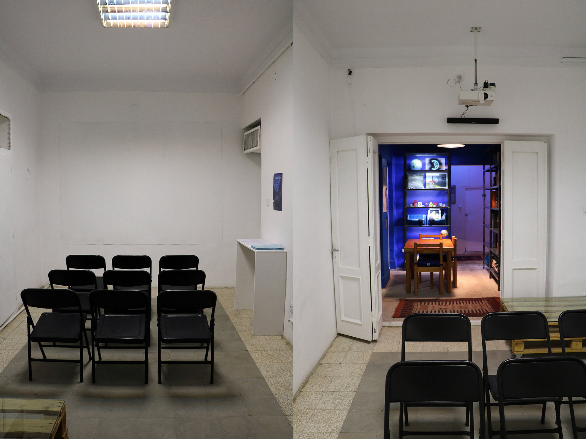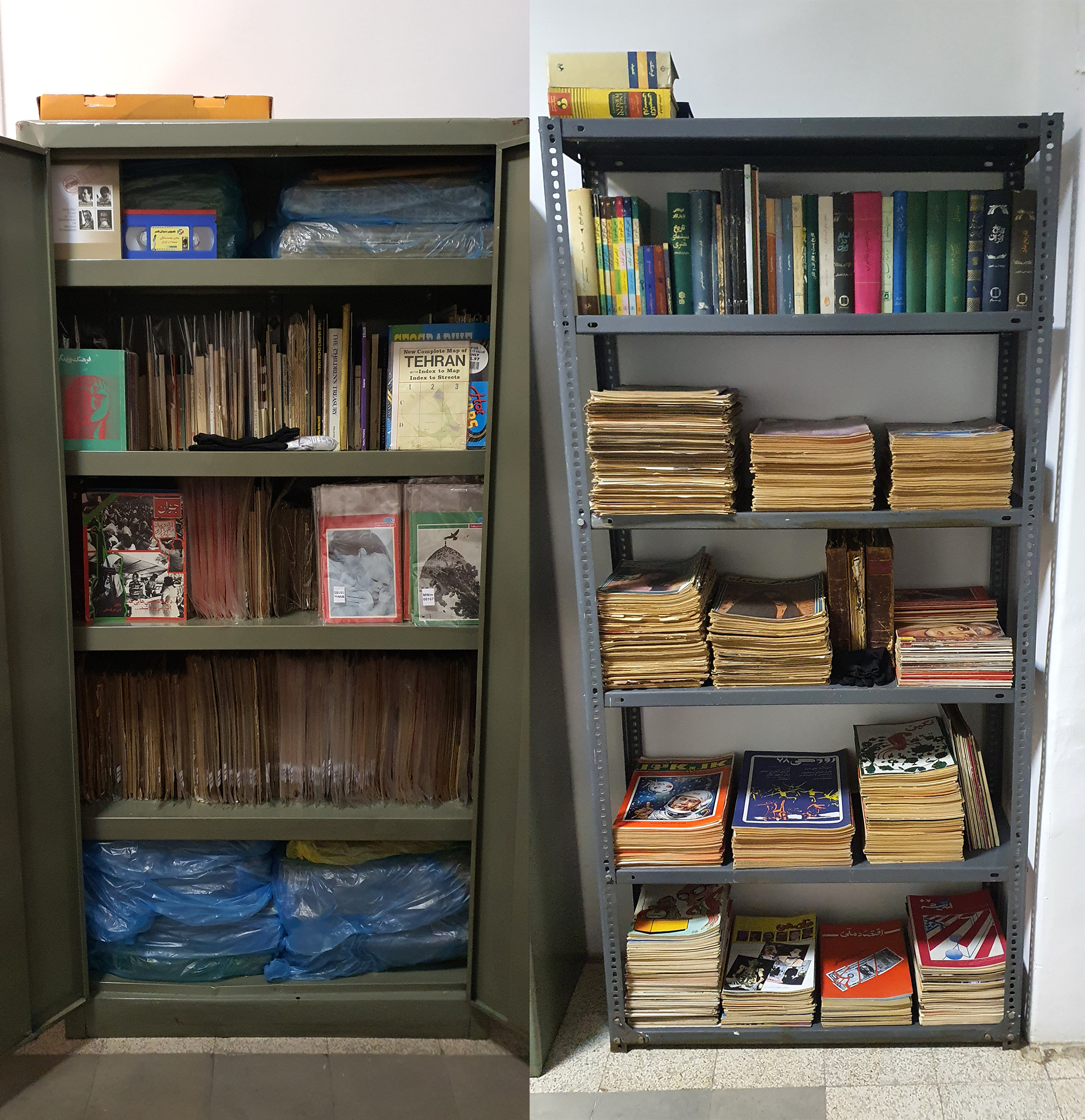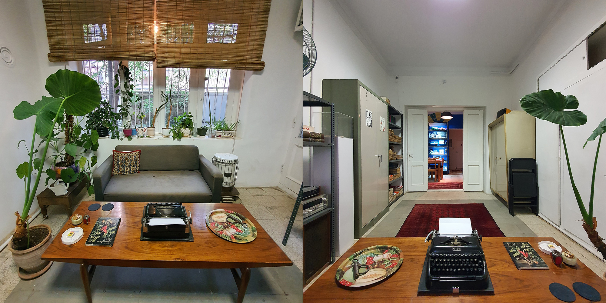 The White Room holds a comprehensive archive of Iranian books, magazines, and newspapers dating back to the early 1950s. The White Room's furniture, electronics, and other objects in the room are all from the same period. The White Room was called the Event Room before COVID-19 outbreak and exhibitions and talks were held part of Sazmanab programming.