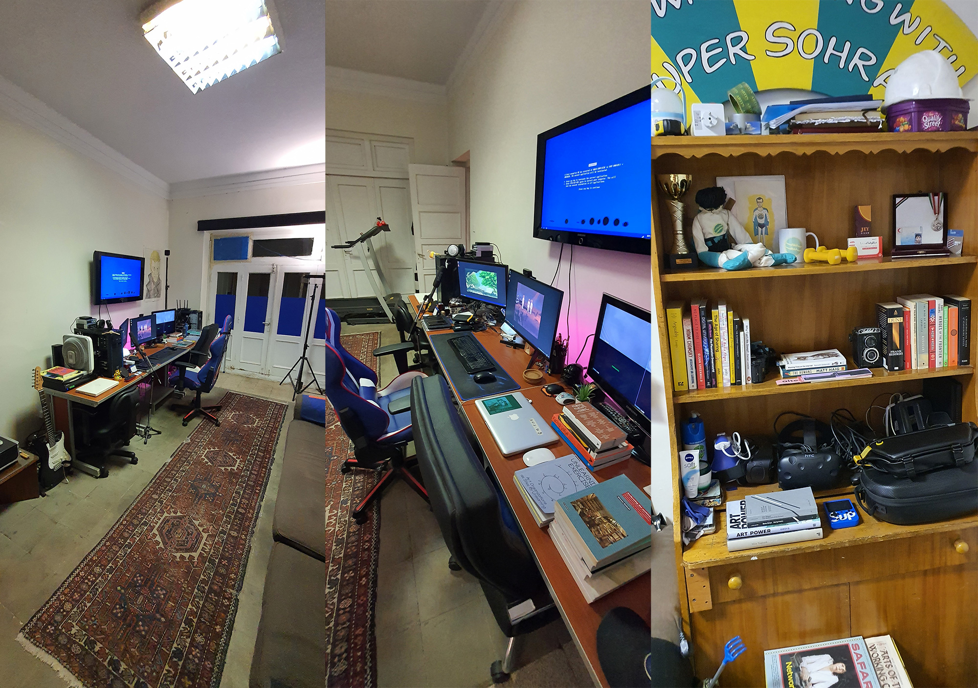 Using months of archiving, every single item in my Tehran apartment was documented in a variety of ways, including photography, scanning, 3D scanning, video, and detailed lists with measurements. Working with a professional fabrication team in Pittsburgh, I spent hours on video calls overseeing the process as they meticulously recreated the apartment’s façade, interior architecture, and all of my personal possessions. Not a single original item traveled there. The fabrication involved extensive installation work to build the apartment itself and all of its fixtures, along with craft work in wood, sculpture, printing, textiles, and other media. Some objects were sourced online, either as exact matches or close equivalents that were then altered to replicate what existed in my apartment.